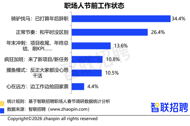 调研数据潜入,有34.4%的职场东说念主照旧“身在曹营心在汉”,肃静筹备着年后下野。春节前后常常是下野岑岭期,不少东说念主会趁着假期一会儿休息后再行开赴。不外,也有13.6%的打工东说念主正在全力冲刺——式样消释、冲KPI等,忙得根蒂停不下来;还有10.8%的东说念主因为新式样、新需求倏得“杀到”,径直切换成“浪漫加班模式”,仅26.4%淡定如常,仿佛春节前也仅仅普凡俗通的一个星期五。