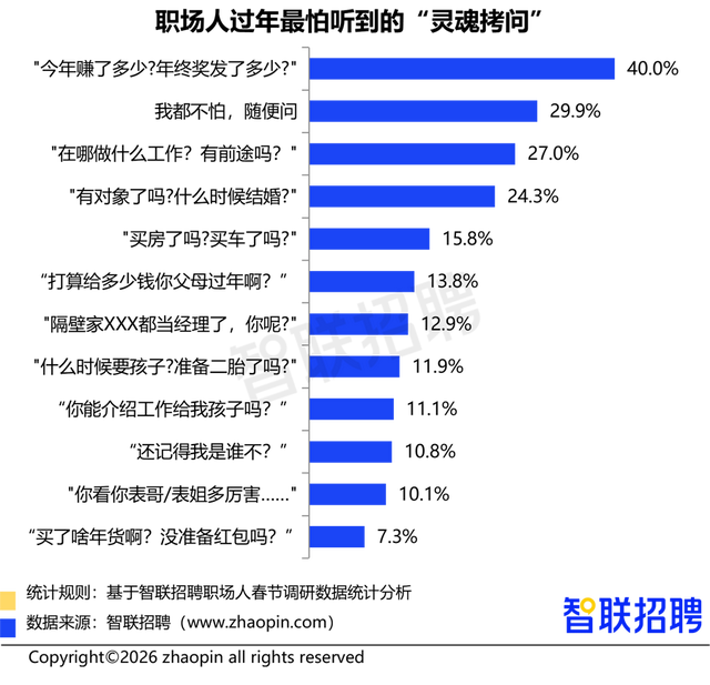 春节酬酢场所里,亲戚们的“灵魂拷问”是弘远职场东说念主躲不开的“劫”。多样“珍视式拷问”中,40%的职场东说念主直指“本年赚了若干?年终奖发了若干?”,成为头号“雷区”;紧随后来的是“在哪工作?作念什么的?有出路吗?”;24.3%的东说念主则对婚恋问题感到惧怕,“有对象了吗?什么时候成亲?”的贬低如五雷轰顶。此外,买房买车、攀比式致敬、“给父母若干过年钱”等说念德勒诈式发问也让不少职场东说念主心生畏俱。不外,也有29.9%的职场东说念主暗示“卤莽问,无所怯怯”,展现出巩固心态。