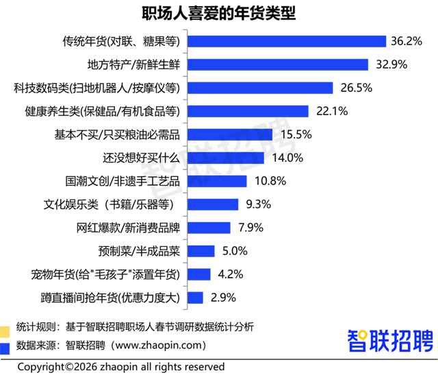 在年货收受上,36.2%的职场东说念主将传统年货(对子、福字、糖果等)列为首选,突显对传统文化的招供与信守,贴福字、备年货的典礼感,仍是打工东说念主心中“过年该有的状貌”。同期,32.9%的东说念主倾向收受处所特产、极新生鲜,大除夜饭品性、结净好意思食受到越来越多东说念主的追捧;另有26.5%的东说念主会选购科技数码类家具(如智高腕表、推拿仪等),既可为父老奉上贴心关怀,也能犒劳我方。