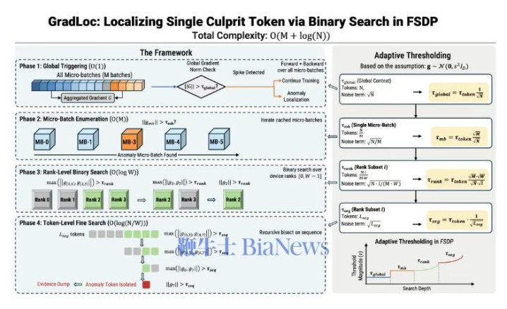技巧达成上,GradLoc针对散播式锻真金不怕火环境进行深度适配,引入二分搜索计谋,将相配定位复杂度由线性级责备至对数级。系统在全局Batch、Micro-Batch、诡计节点(Rank)与Token等不同层级间逐级平缓范围,快速锁定相配起原。为普及着力,GradLoc领受诡计式深度优先搜索计谋,乐鱼优先跟踪梯度范数较大的分支,在险些不加多稀薄耗时的情况下定位多个相配Token。同期,器具鸠合梯度向量统计特质联想自适合阈值机制,以责备误检与漏检风险。