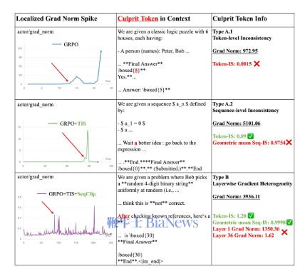 锻真金不怕火崩溃是RLVR实施中的常见挑战,频繁表现为模子准确率骤降,并随同梯度范数相配波动。在传统排查经由中,盘考东谈主员只可依据全局测度打算如grad_norm弧线进行领导推断,再通过端到端本质考证假定,过程高度依赖个东谈主领导,考证周期长回去因朦拢。GradLoc则将问题颗粒度从“全局”鼓吹至“微不雅”,通过定位相配Token,为工程排查提供径直字据。