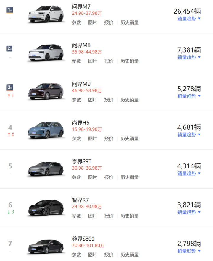投入前三名的还包括鸿蒙智行,1月销量为57915辆,同比增长65.5%。当今鸿蒙智行旗下已布局AITO问界、LUXEED智界、STELATO享界、MAEXTRO尊界、SAIC尚界五大品牌,居品诡秘20万至150万元价钱带。零卖数据高傲,1月鸿蒙智行旗下居品销量最高的车型为问界M7,销量为26454辆;问界M8、问界M9销量分歧为7381辆和5278辆。此外,尚界H5、享界S9T销量为4681辆和4314辆。