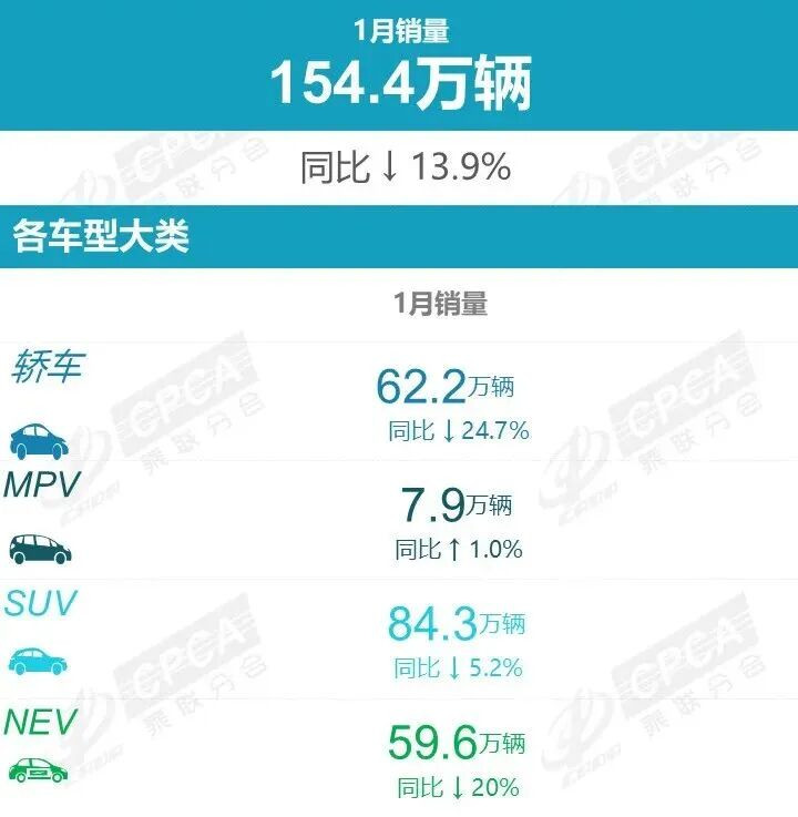 2月14日,乘联分会发布2026年1月厂商销量排行快报。数据高傲,2026年1月世界乘用车市集零卖销量为154.4万辆,同比下滑13.9%。其中,新动力汽车零卖销量为59.6万辆,同比下滑20.0%,新动力汽车渗入率为38%。
