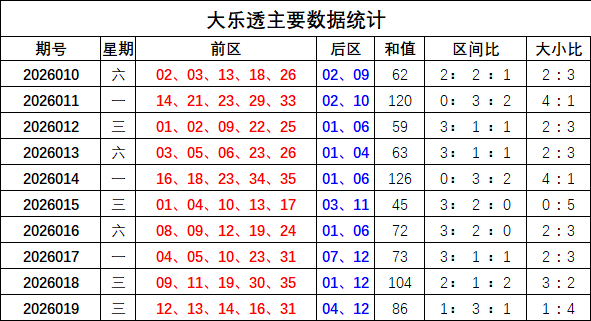 上期回来:大乐透上期奖号为:前区12 13 14 16 31,后区04 12,前区奖号和值为86,区间比1:3:1,大小比为1:4,