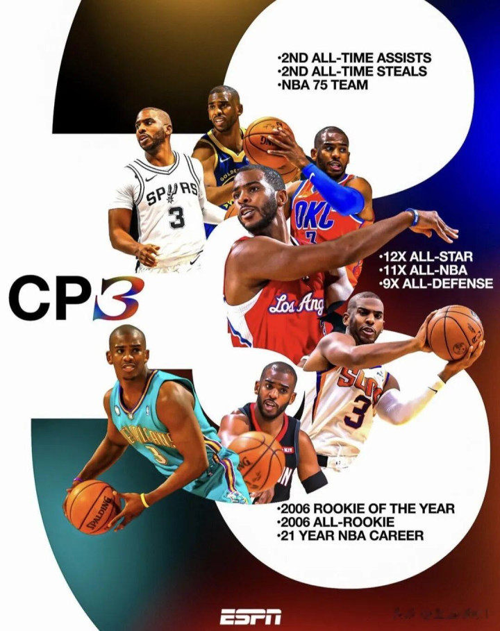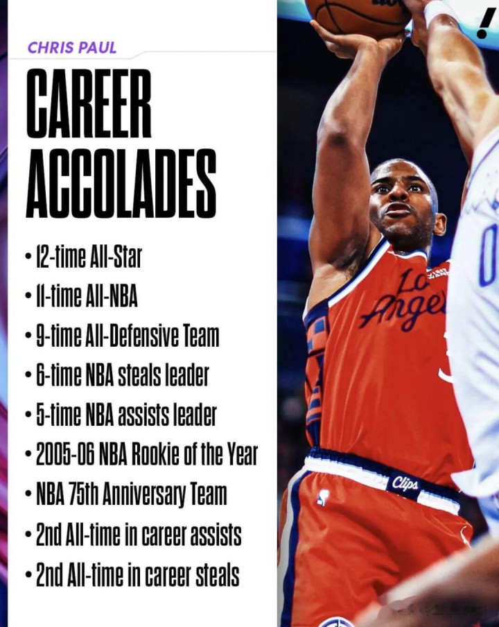 在NBA赛场,保罗出战了1370场旧例赛,场均得到16.8分4.4篮板9.2助攻2抢断,季后赛(149场)场均拿下20分4.9篮板8.3助攻1.9抢断,在旧例赛助攻和抢断上齐名次历史第二。